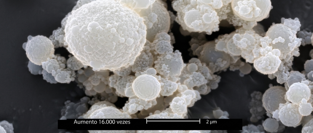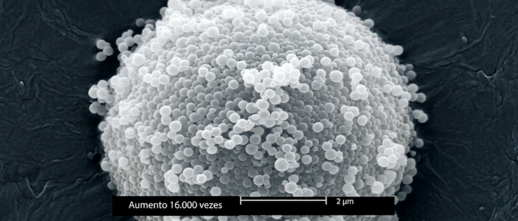 Micrografia de um aglomerado de partículas primárias de polímero PVC, observada através do Microscópio Eletrônico de Varredura. Aumento de 16.000vezes. Fonte Braskem.